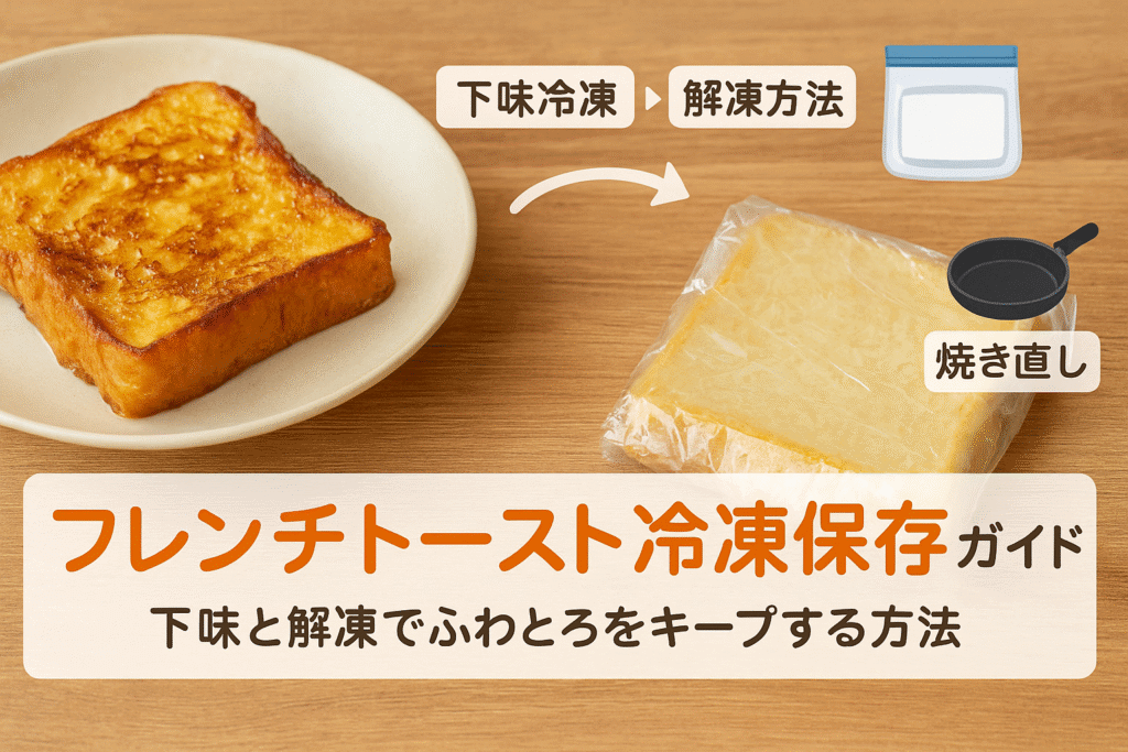 牛乳がない日も、豆乳や生クリーム、水+粉ミルクなどで十分おいしく作れます。豆乳はあっさり、生クリームは濃厚、水を使う場合は砂糖とバターでコクを足すとバランスが整います。冷凍パンを使う際は、下味の砂糖やバニラを少し強めにして香りを補い、冷凍の風味変化を感じにくくします。乳不使用にしたい時は豆乳+メープルが相性抜群です。離乳食向けは砂糖を控え、卵黄のみやきな粉で香ばしさを加えるとやさしい味になります。解凍はレンジ短時間か自然解凍、焼きは弱火中心が失敗しにくいです。冷凍保存は焼いた後でも可能で、粗熱を取りラップ→保存袋で密閉します。再加熱はレンジ短時間ののち、トースターで表面を整えると、サクッとした食感が戻ります。