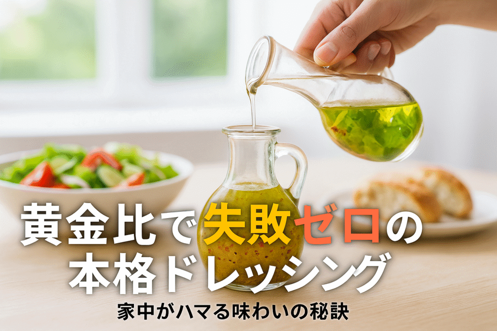 サラダは好きなのに「家のドレッシングが決まらない」「毎回味がブレる」——そんなお悩みは、比率で覚えるだけで解決できます。家庭料理研究の調査では、計量スプーンを使うより「比率記憶」のほうが再現性が高いと示されています(農林水産省の家庭料理調査・公開資料より)。本記事は、忙しくても失敗しない手順に落とし込みました。